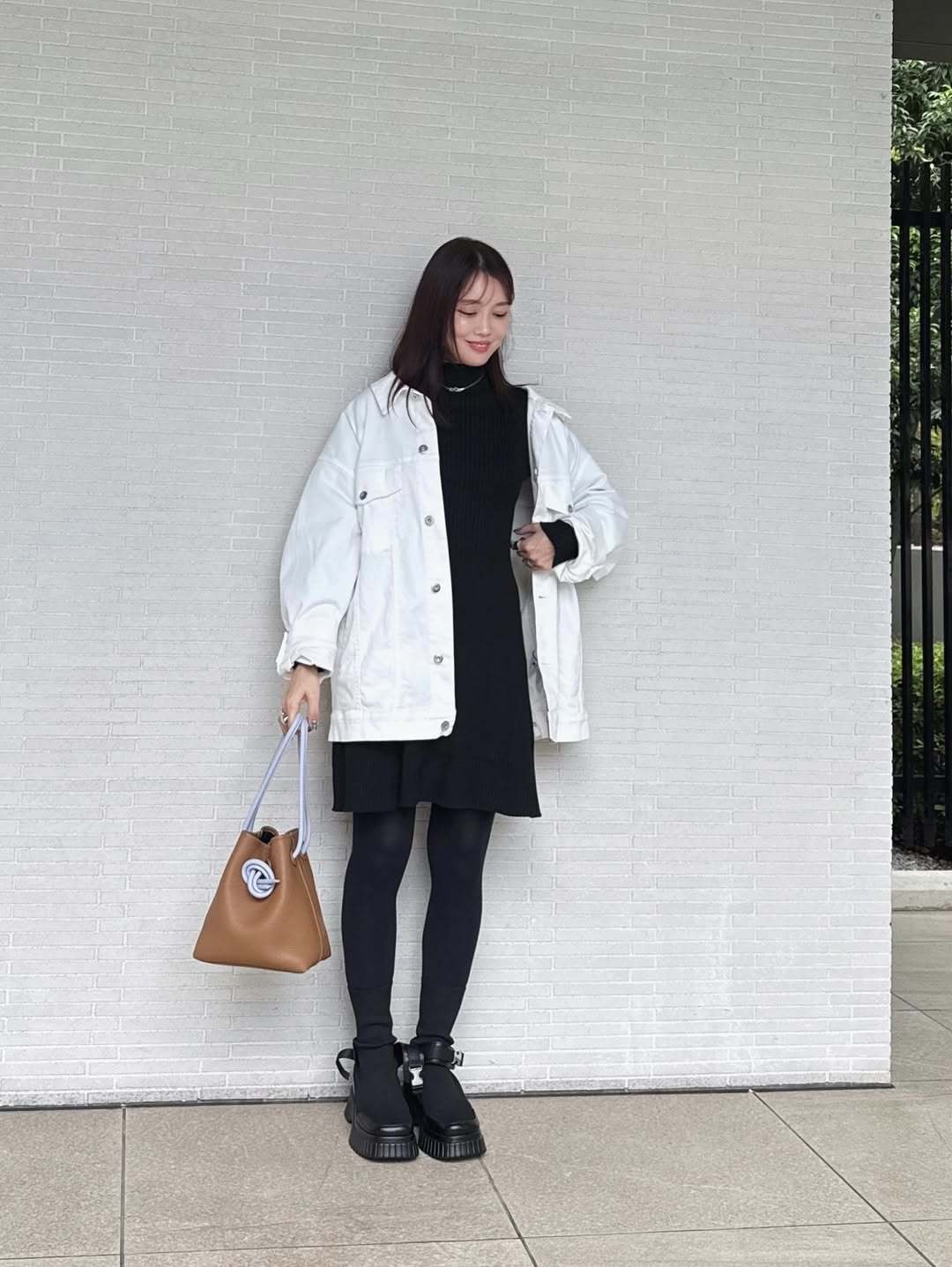 黒ワンピに黒タイツを合わせることで、40代の方も品よくミニ丈を着こなせます。
