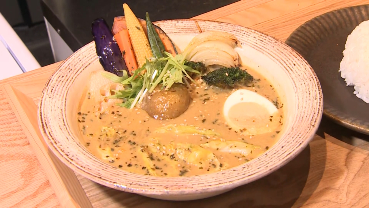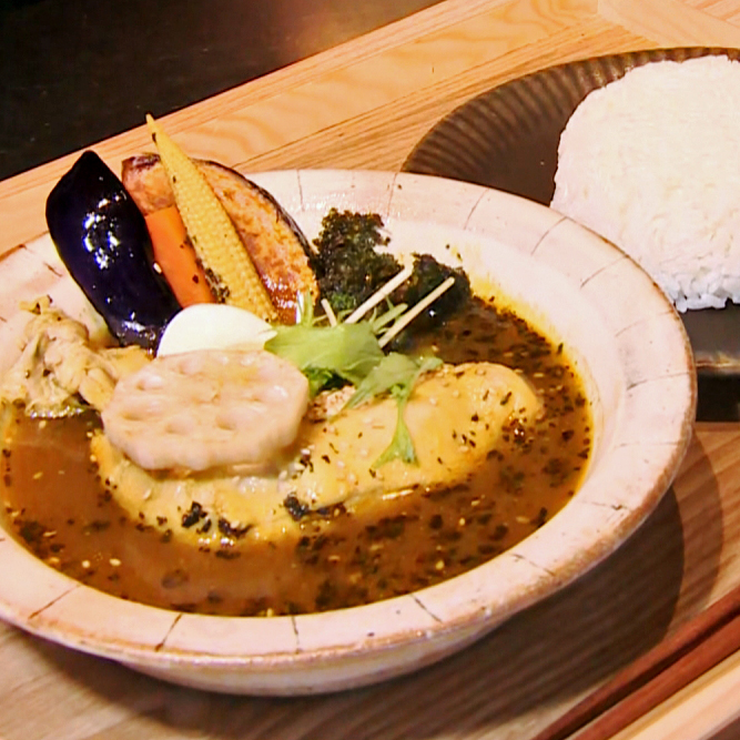 だしを取るためのチキンを捨てるのがもったいないという理由から食べられるようになったという札幌のスープカレー。さらさらのスパイシーなスープとほろほろの鶏肉、色とりどりの野菜が食欲をそそります。