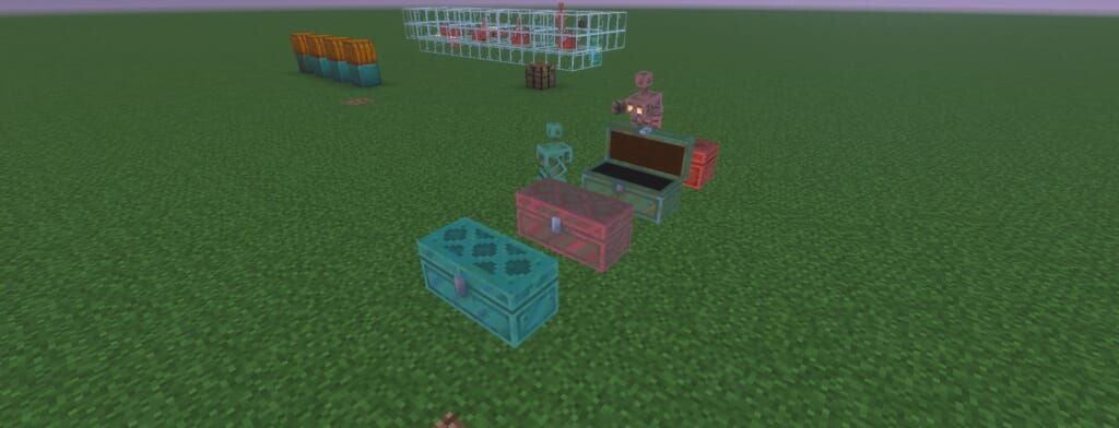 銅ゴーレムと銅チェストは、作成に使用した銅ブロックの酸化の進行の度合いによって色が変わります。