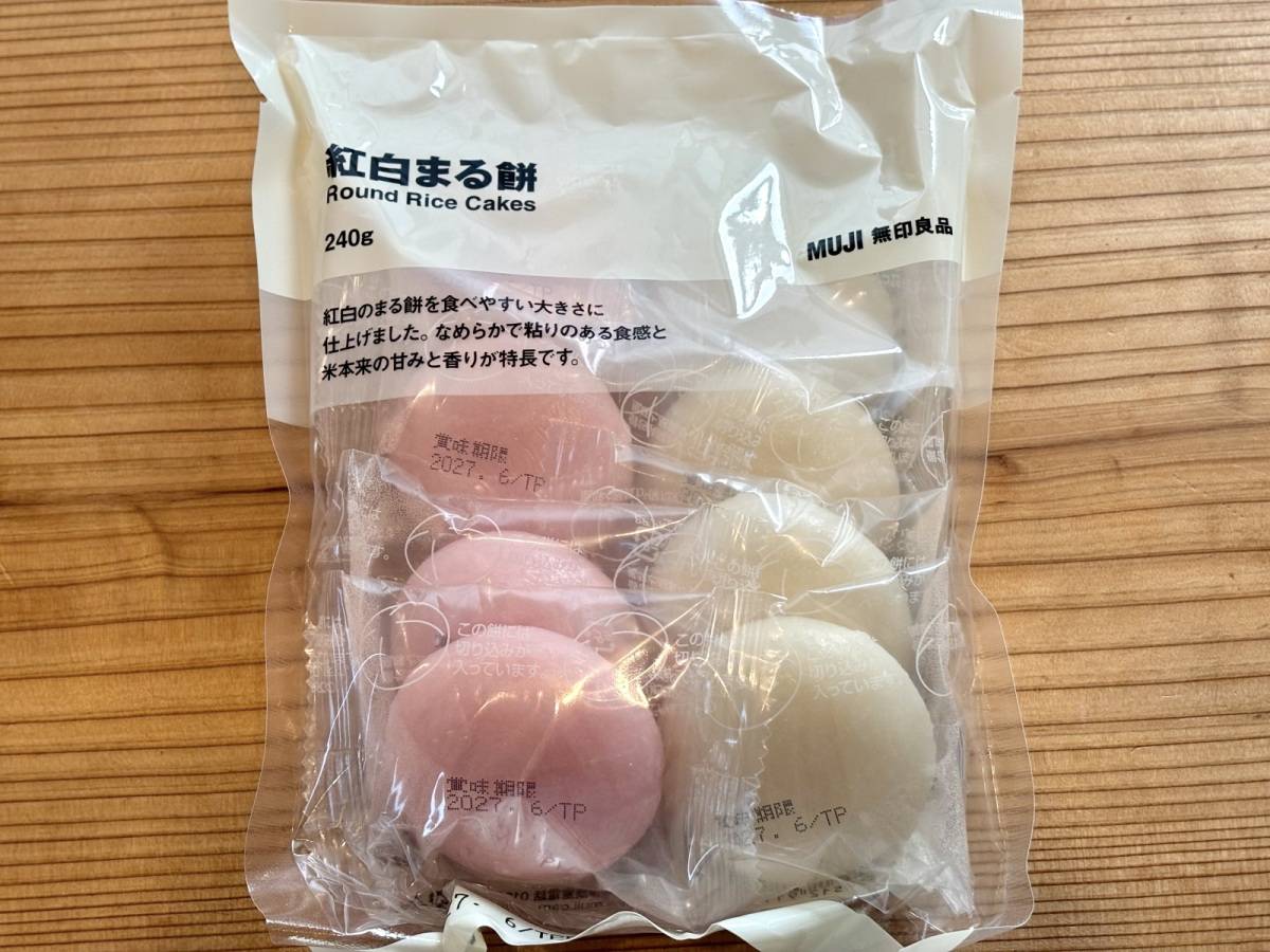 無印良品の食品コーナーに並んだ、季節限定商品の紅白まる餅。
