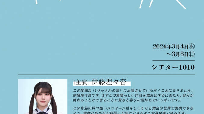 伊藤理々杏(乃木坂46)、主演舞台『1リットルの涙』2026年3月上演決定!