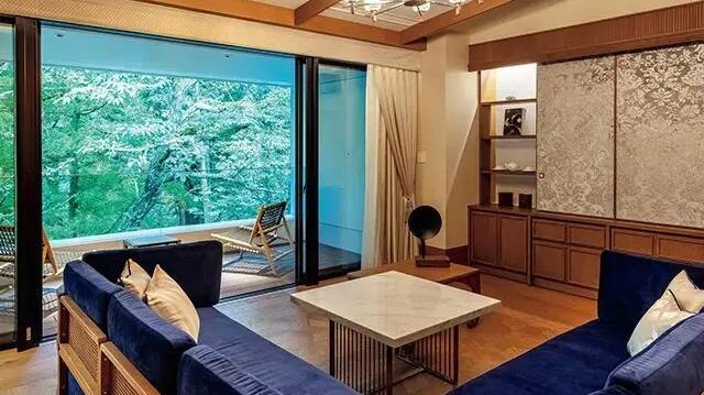 テラスの一角は水鏡になっており、自然そのものが映し出されます。もみじの色彩に欄干の朱がよく映え、美しいコントラストを楽しめます。