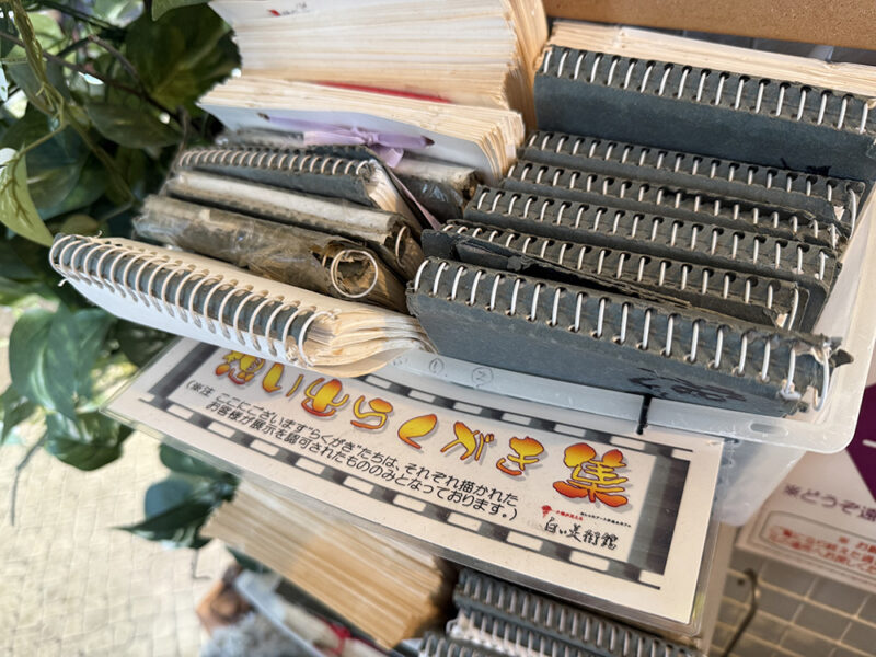 これまでに来館したお客さまが書いた「想い出らくがき帳」。さまざまな方の思いが詰まっているので、カフェタイムの合間に読んでみてはいかがでしょうか。