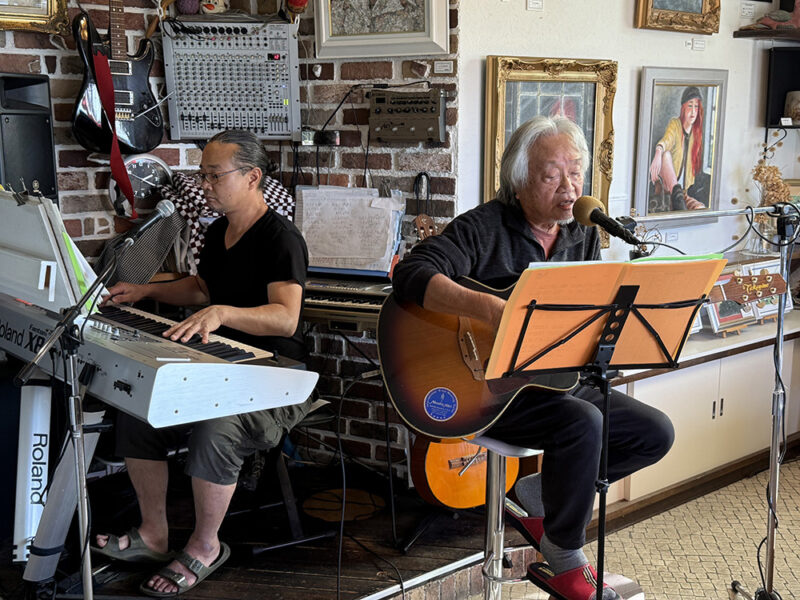 左が館長の井上祐輝さん、右が祐輝さんの父であり専属作家の祐三郎さん。お客さまからのリクエストがあれば、このようにオリジナルソングの生演奏を行うことも。
