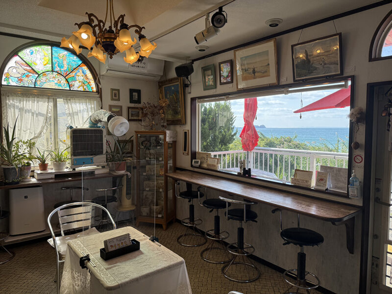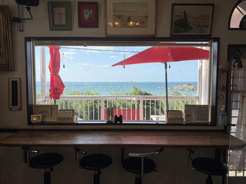 海側のカウンター席からの眺望。窓枠を絵画のフレームに見立てると、まるで風景画のようです。