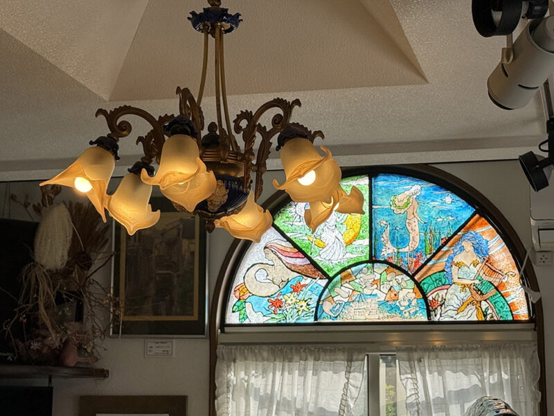 ステンドグラス調のアーチ窓やアンティーク調のシャンデリアが、非日常的な雰囲気を演出しています。