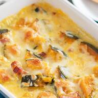 ③ 同じフライパンにサラダ油を引き、②を戻してこんがり焼き色がつくまで焼く。焼き上がったら耐熱皿に取り出す。