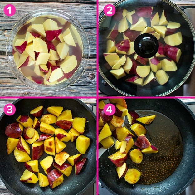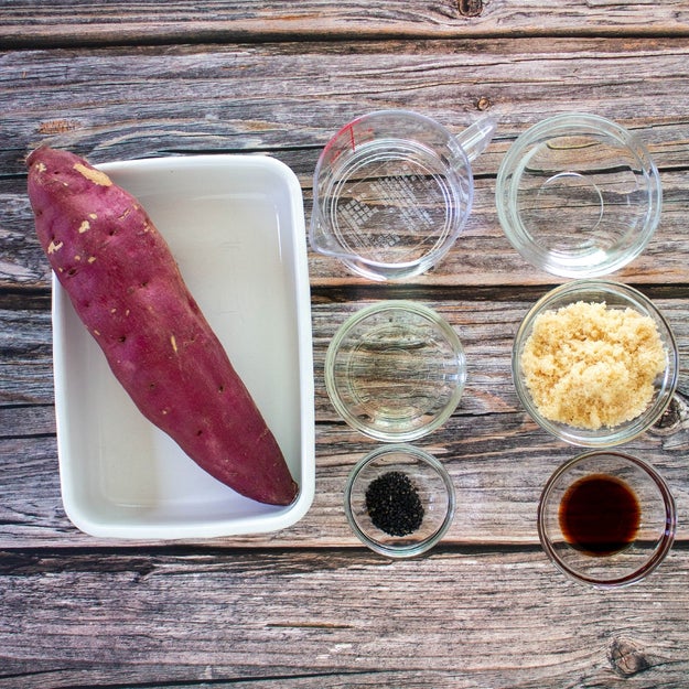 ① さつまいもを乱切りにし、水を張ったボウルに入れて5分ほどあく抜きする。ザルにあげて水気を切る。