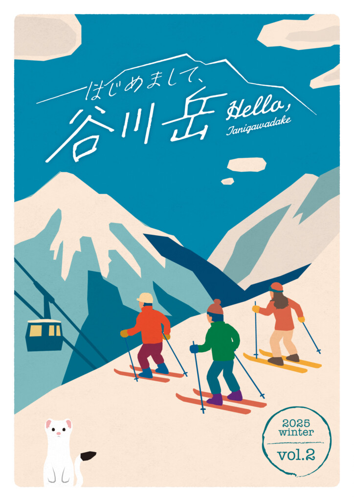 冬の谷川岳を連想させる世界観に、スキーや冬毛のオコジョのイラストを添えた表紙デザイン。登山客はもちろん、観光で訪れる人にも「手に取りやすい・どこか懐かしい」雰囲気を意識しています。