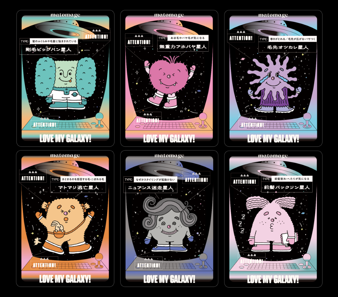 今回のイベントは「宇宙」がテーマとなっているため、髪の毛にまつわる悩みを「無重力アホパヤ星人」「剛毛ビッグバン星人」など、全6種のキャラクターとしてチャーミングに表現。各キャラクターごとに、おすすめの商品と使用方法が一目で分かるパーソナライズカードを配布する。6種のキャラクターは、イラストレーターのREDFISHが描き下ろしたオリジナルデザインとなっている。
