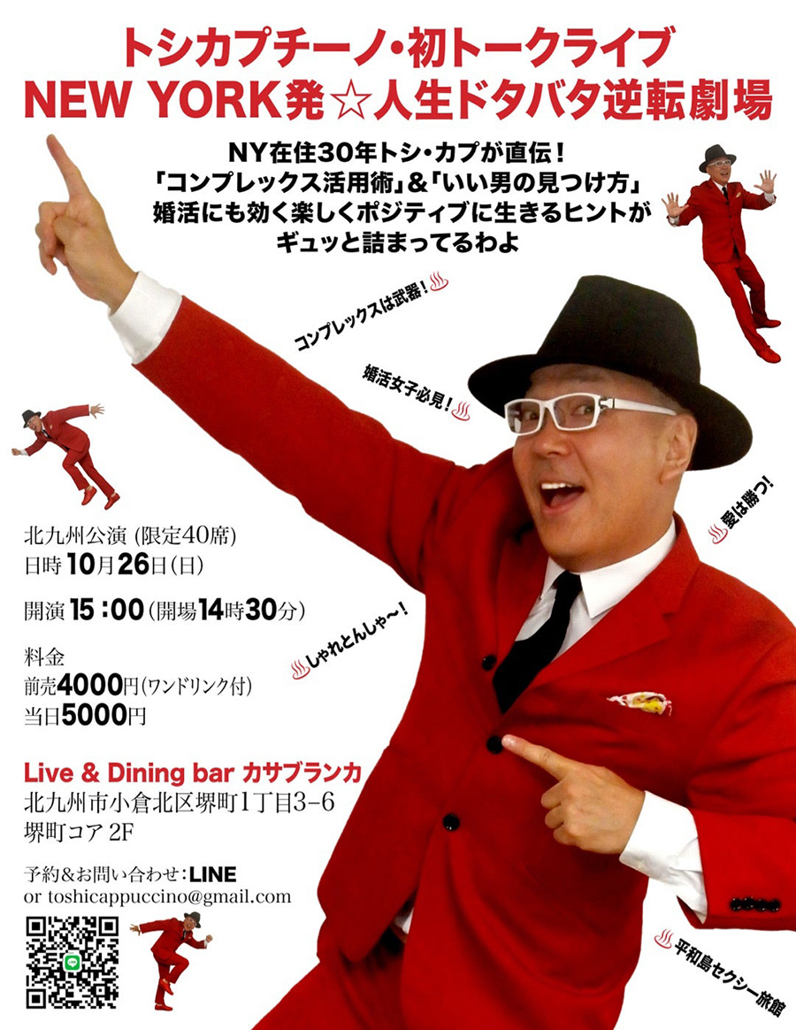 ニューヨークを拠点に活動する昭和歌謡芸人・トシ・カプチーノが、10月26日(日)に北九州市でトークライブ日本公演を開催します。