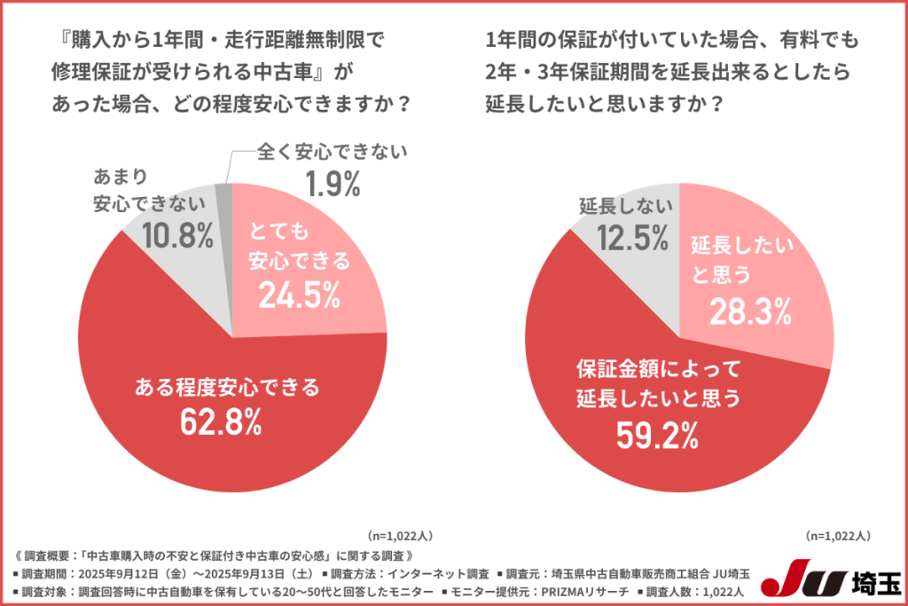 中古車の「保証付き販売」はその解決策のひとつとされるが、消費者は実際にどのような要素を重視し、どのような安心感を得ているのだろうか。そこには「保証」という言葉以上に、購入体験全体を左右する心理が隠れている。そこで今回、埼玉県中古自動車販売商工組合 JU埼玉(https://ju-saitama.com/)は、中古自動車を保有している20~50代の方に、「中古車購入時の不安と保証付き中古車の安心感」に関する調査を実施した。