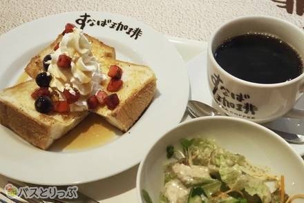 フレンチトーストはホイップクリームたっぷり。また珈琲もおいしく、フレンチトーストの甘みととてもよく合いました。モーニングセットだとサラダが付いてくるのも嬉しいです。