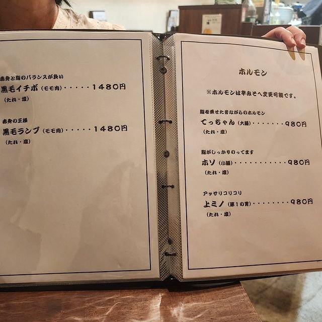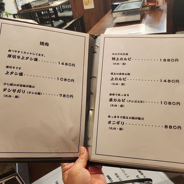 相方は「いいちこお湯割り」¥480を注文しつつ、何を食べようかなあ!とメニューを確認。立派なメニューなのですが、年配者向けなのか字が超デッカイ!ので、一覧性はないメニュー。が、1人で回している焼肉店とすると、かなりメニューが豊富!焼肉の各部位単価は一番お高い特上カルビが¥1880、他の上物は¥1500前後ぐらいの安全安心価格店。