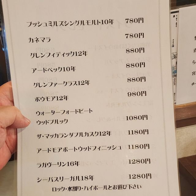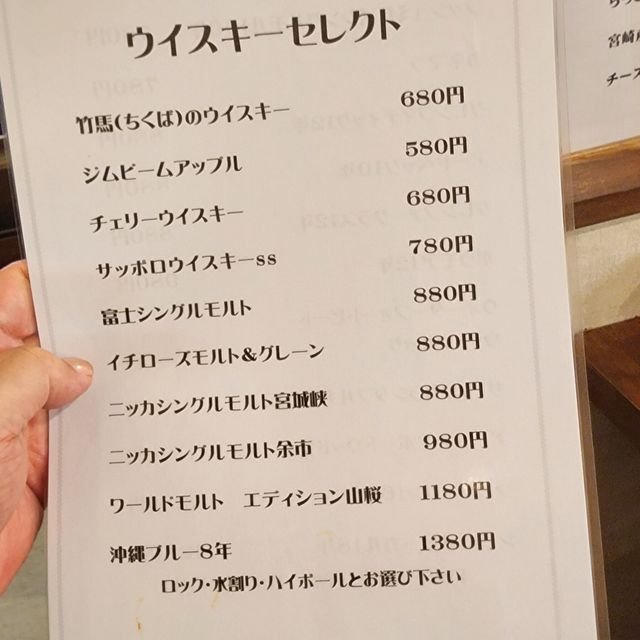 で、飲み物を追加しようとすると、通常の居酒屋にある様なドリンクメニュー以外にウイスキーのメニューがあるのを発見! うわー、これはハイボール好きは超喜びますな。ジャパニーズで揃えているのか!と思ったら・・・