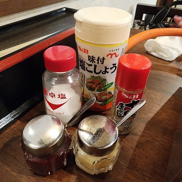 味変アイテムはコチジャン、おろしニンニク、七味に食卓塩、塩胡椒と言う布陣。(我々的にはコチジャン必須・・)