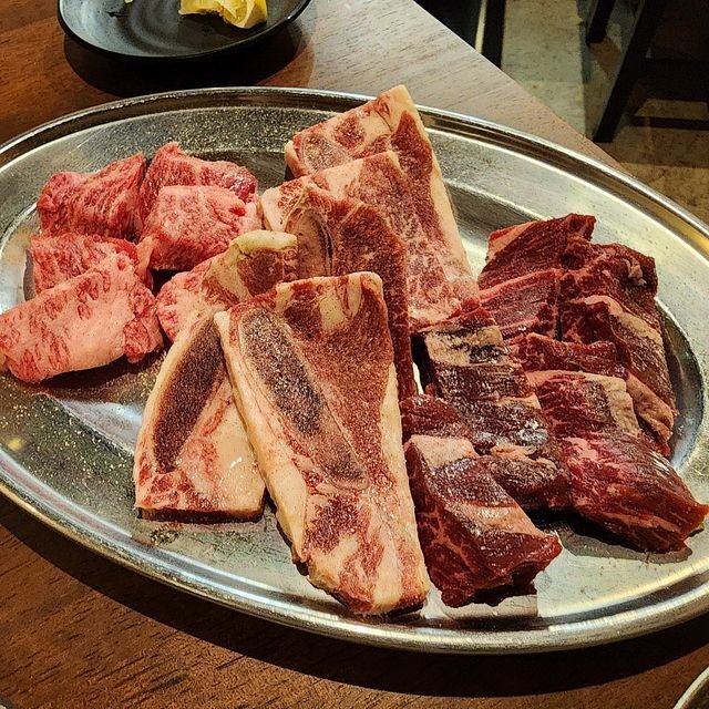 「赤身盛り」¥3580もババーンと登場。上カルビ、骨付きカルビ、ハラミが盛り合わせになったお得メニューで盛り込みしっかり。塩・・タレをチョイスできるので塩でお願いしました。