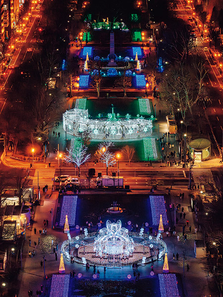 大通公園をはじめ、札幌市内中心部の5カ所で行なわれる冬の風物詩「さっぽろホワイトイルミネーション」。体験型の展示やイベント、光と音の演出など、会場ごとに異なる様々なイルミネーションの魅力を楽しめる。冬の夜に灯る電飾が札幌の街を美しく彩る、この季節だけの景色をお楽しみに。