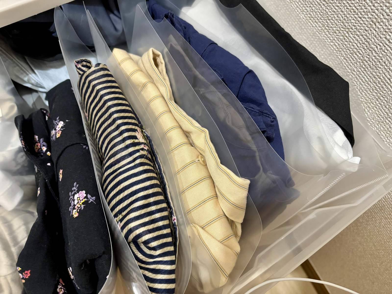 クリアファイルを使うことで、立てて収納できるため、引き出しの中も整然と保て、服選びのストレスも軽減されやすいです。柔らかい素材やシワが気になるシャツ・ブラウスの収納にぴったりの方法です。忙しい朝でもサッと取り出せる、毎日の身支度を快適にする賢いアイデアとして、ぜひ取り入れてみてください。