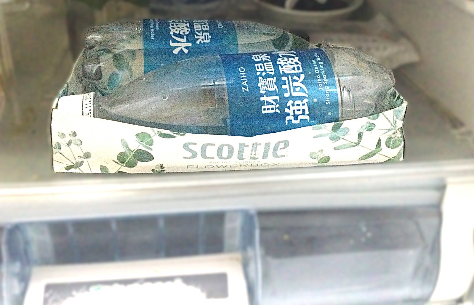 ティッシュの空き箱は、冷蔵庫でペットボトルを収納するときに役立ちます。