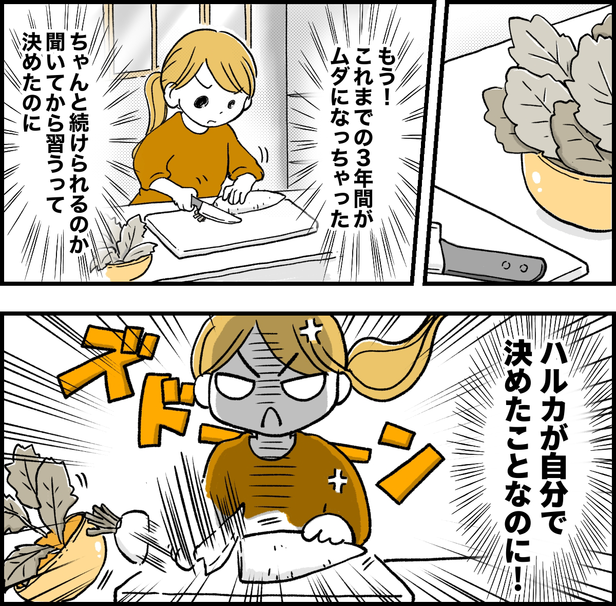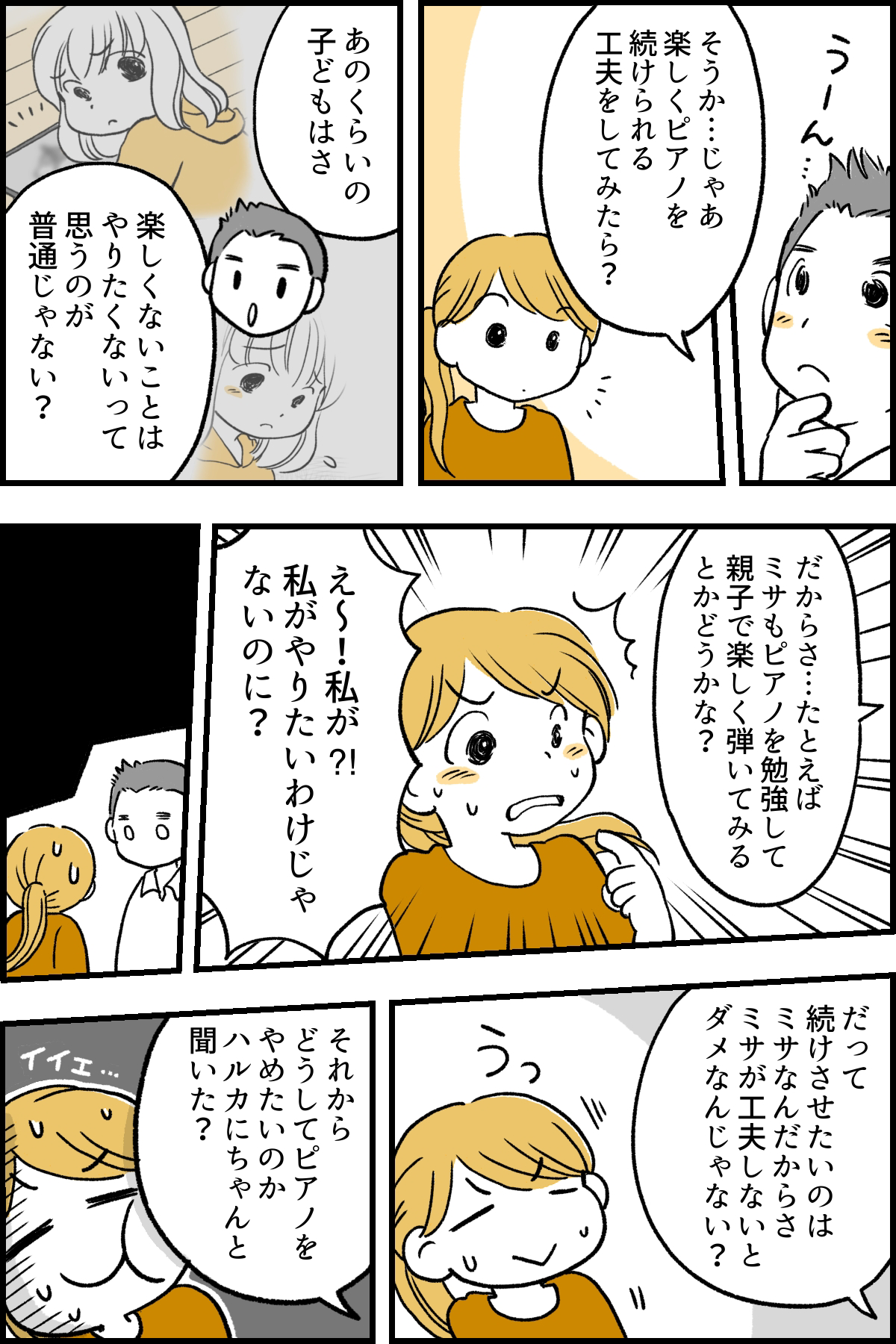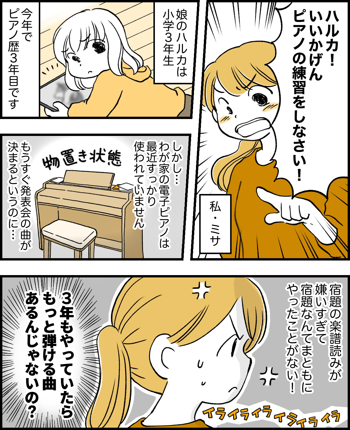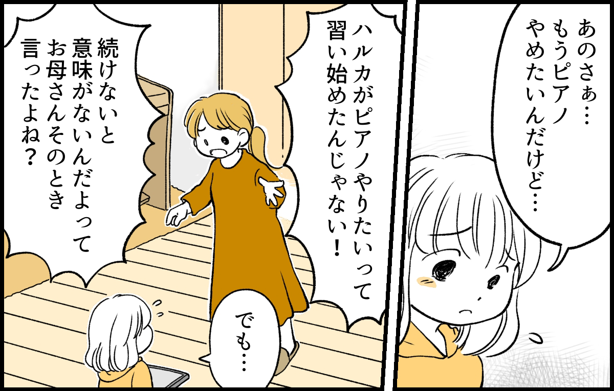 いままでの時間がムダになってしまった……。ちゃんと練習して続けられるのか聞いてから決めたのに。自分で決めたことなのに! ハルカがピアノの練習をしないことや、やめたいと言ったこと。いろいろなことが私をイライラさせたのです。