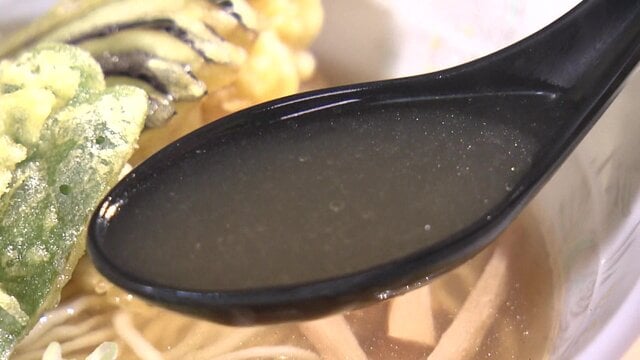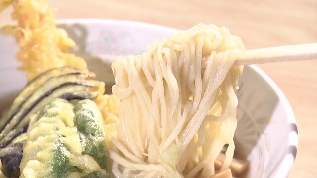 季節に合わせて水の配合を調整し、1〜2日寝かせて旨味を凝縮させた、やや縮れた細麺はツルツルでもちもち。みずみずしい食感が心地よく、天ぷらと醤油味のスープとの相性も抜群です。