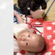 ごまちゃんの重みで落ち着いたのか(?)赤ちゃんは目を閉じて眠りに落ちたようです。赤ちゃんが寝たことに気づいたのか、ごまちゃんは赤ちゃんを起こさないように、驚かさないように、ひたすら静止を続けたとのこと。優しいですね。