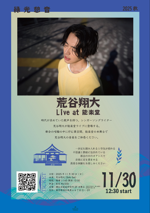 11月30日(日)昼公演の『荒谷翔大 Live at 能楽堂』には、荒谷翔大がソロセットで登場する。