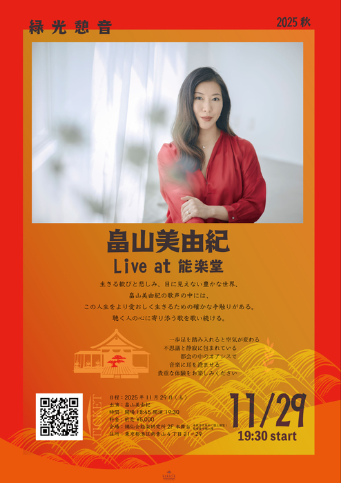 アコースティックライブシリーズ『緑光憩音2025秋』が、11月28日(金)・29日(土)・30日(日)の3日間にわたり、東京・銕仙会能楽研究所2F本舞台で開催されることが決定した。