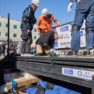 体育館では、避難所のトイレの組み立て、段ボールベッドやパーティションの設置について体験。また、骨折した腕を三角巾やレジ袋で固定する応急処置や、自動体外式除細動器(AED)を用いた心肺蘇生法の指導なども行われた。
