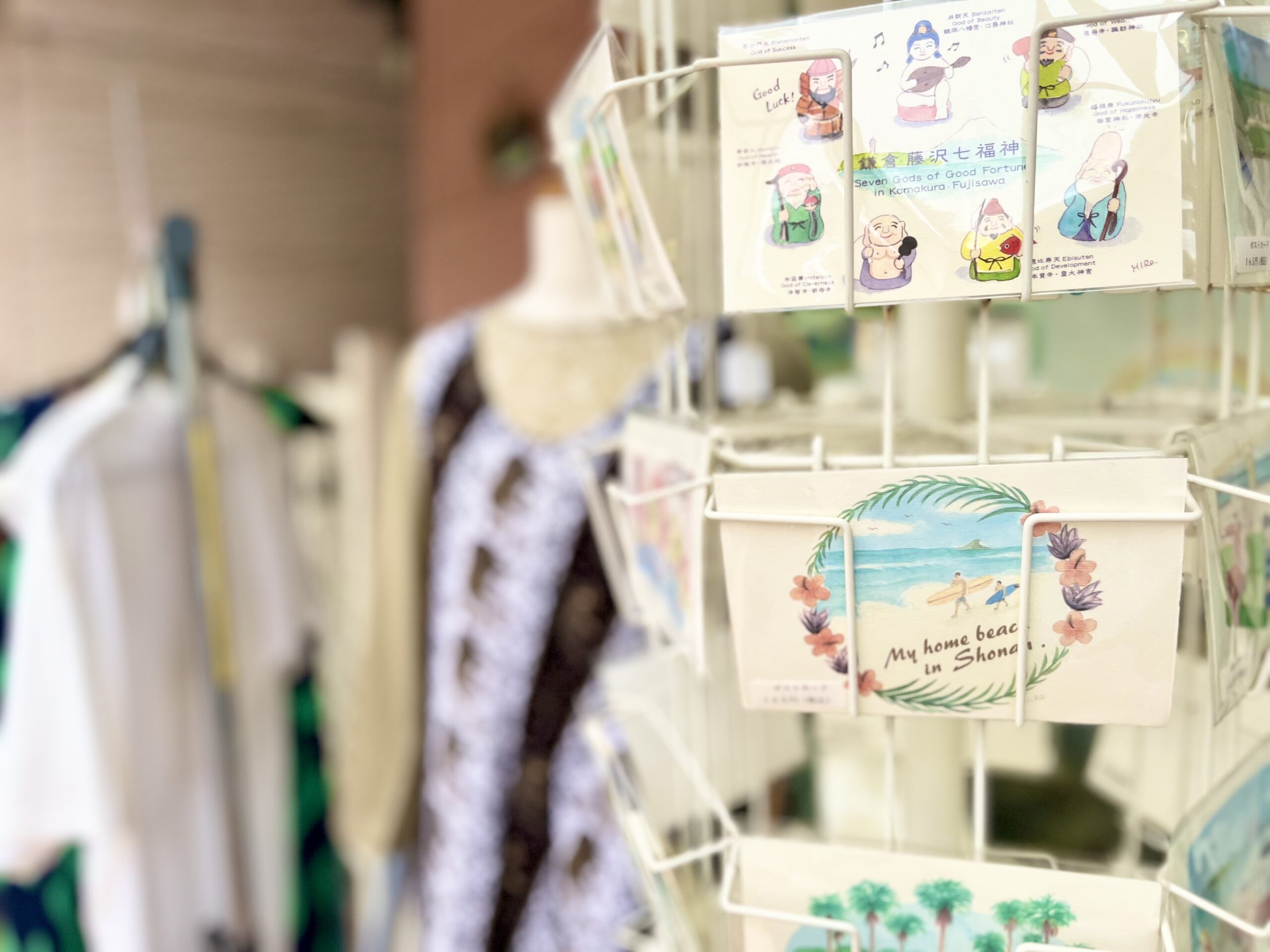 その後リサイクルをやりながら、雑貨ショップを始める際、「何か商品を置かないと」と考えていたとき、かつて仕事をしていた「湘南スピリット」さんとのご縁が再びつながったそう。そこから、同ブランドのアイテムを扱うショップとして、全商品のオンライン販売をスタート。やがてお店には、湘南のアーティストによる作品をはじめ、ハワイ在住の友人がセレクトした日本未入荷の雑貨、そして藤沢の地元クリエイターによるアイテムなどが並ぶようになりました。