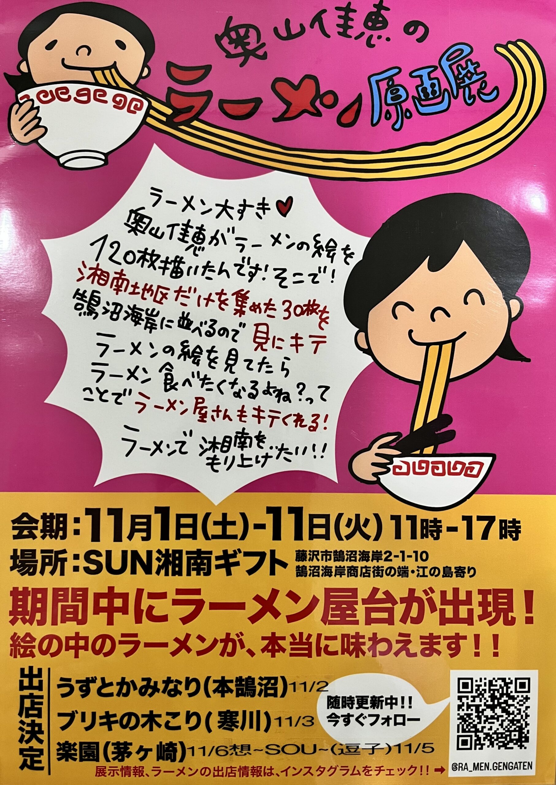11月1日から11日までは「ラーメン原画展」も開催予定。期間中にラーメン屋台が出現し、絵の中のラーメンが、本当に味わえるそう!!ここ鵠沼海岸の小さなギャラリーは、アートに触れ、人とつながり、元気をもらえる場所。
