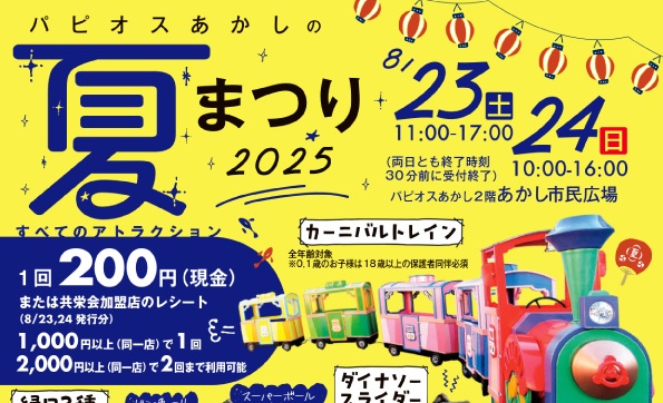 明石駅前にある『パピオス明石』2階あかし市民広場で8月23日・24日の2日間、「パピオスあかしの夏まつり2025」が開催されます。入場は無料。