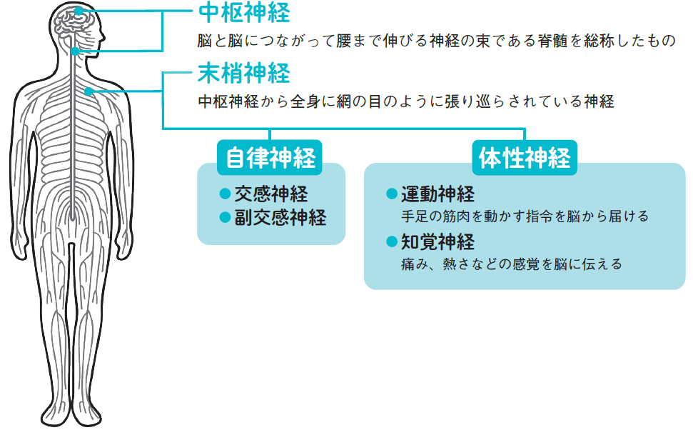 神経系は中枢神経と末梢神経に大きく分類されます。末梢神経は中枢神経である脳と脊髄から枝分かれし、全身に張り巡らされている神経ですが、さらに体性神経、自律神経に分けられます。体性神経は筋肉を動かし、痛みを伝える神経で、自分の意思で動かせます。一方、自律神経は呼吸や心臓の鼓動、内臓の働き、体温調節といった生命維持に必要な機能をコントロールする神経で、自分の意思とは無関係に働いているのが特徴です。