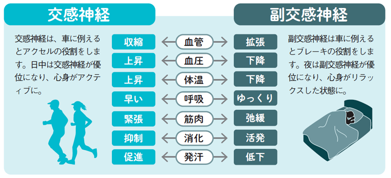 自律神経は24時間休みなく働き、自分の意思でコントロールできないのが特徴。心身を活動的にする「交感神経」と休息させる「副交感神経」の2種類があり、2つがバランス良く働くことで健康が維持できます。