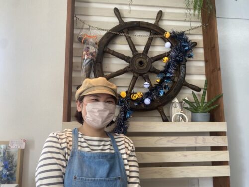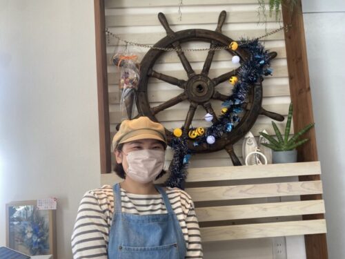 林さんの背後に写っている、船のかじ取りに使う大きな舵輪。天草で船長をされていたお祖父様から引き継がれました。パン舵輪じゃなくて舵林なのは林さんのお名前との組み合わせです。