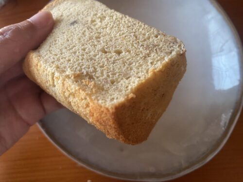 バナナの香りと味をしっかり感じられるほどに、たっぷりのバナナが入っています。しっとりとしたきめ細かい生地も、まさにシフォンケーキの名前の由来通り絹のような食感です。