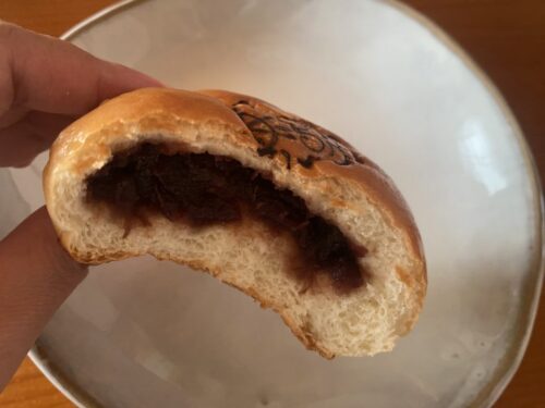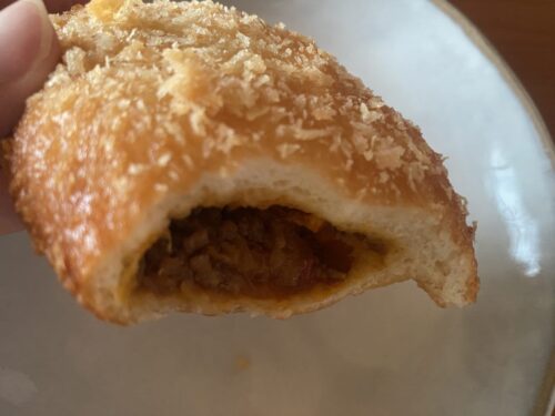 店長さんはカレーが大好きで、「カレーパン」、イカ墨で黒い見た目の魚介の旨味がマシマシの「シーフードカレーパン」、具に野菜のみを使用して揚げずに焼いたヘルシーでしっかり辛い「野菜カレーパン」と3種類ものカレーパンを販売しています。本日食べたこの「カレーパン」は、辛すぎず、ひき肉と野菜の具がたっぷり入っていて子供でも食べやすいお味です。