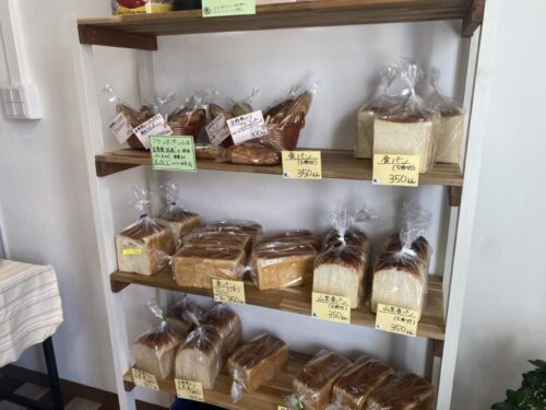 店の右側には食パン、フランスパンのコーナー。こちらも、四角いパンや山形パン、ライ麦パンなど色々な種類があります。