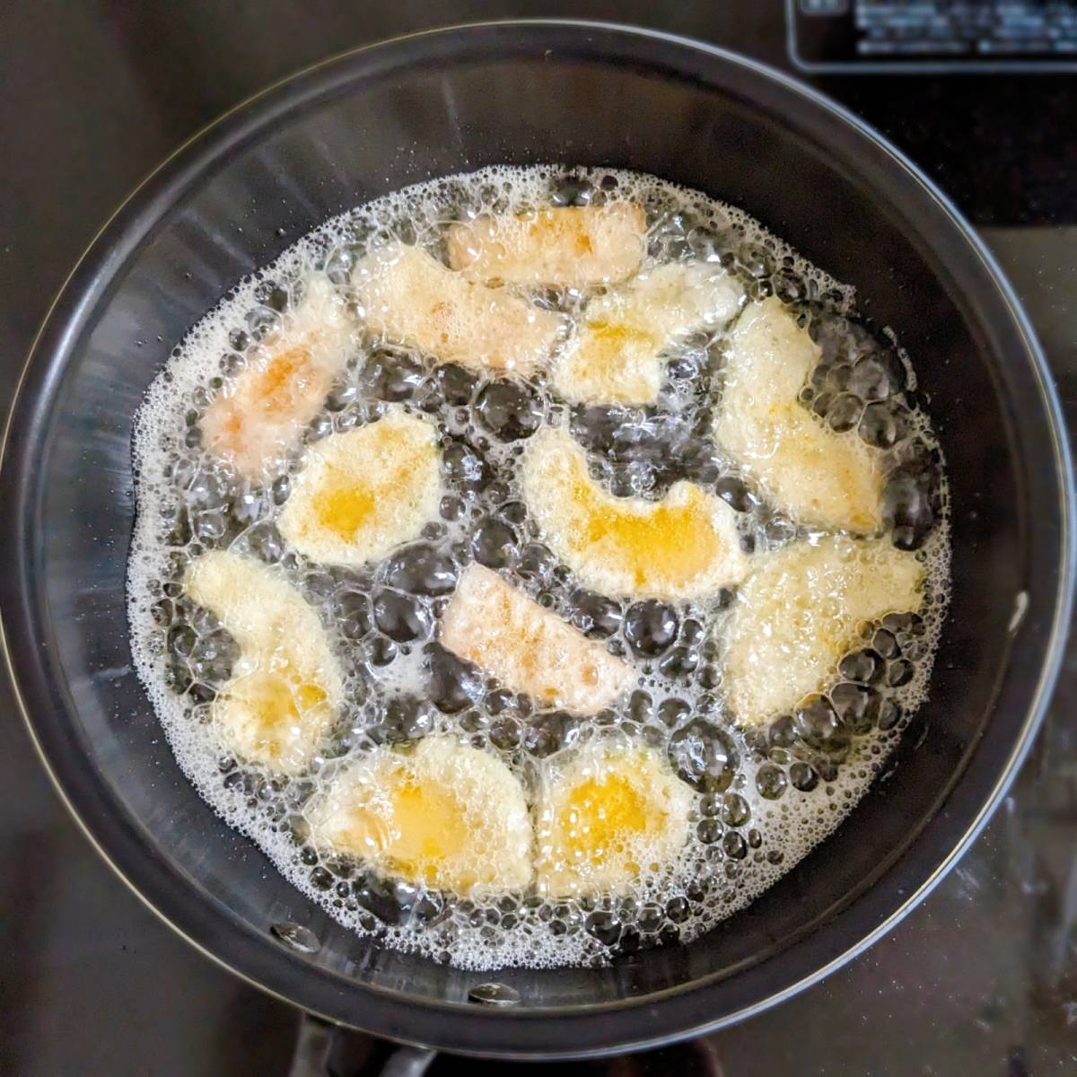 ①の野菜に②の衣をつけて、油でこんがりと揚げていきます。