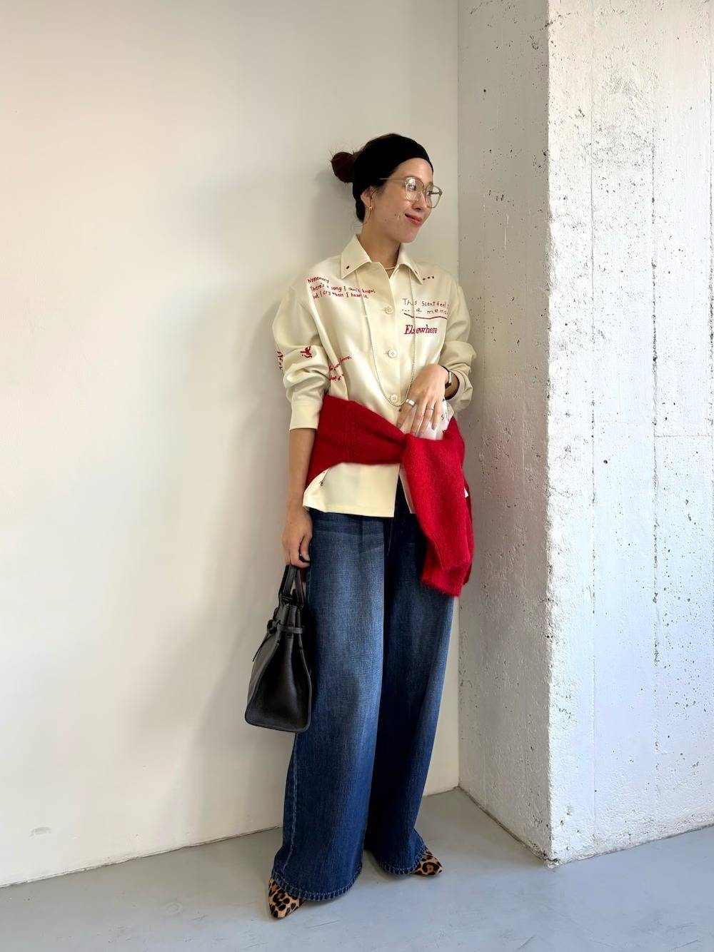 【10月編】老け見えしないデニムパンツコーデ③カラーカーディガンを腰巻きする♪