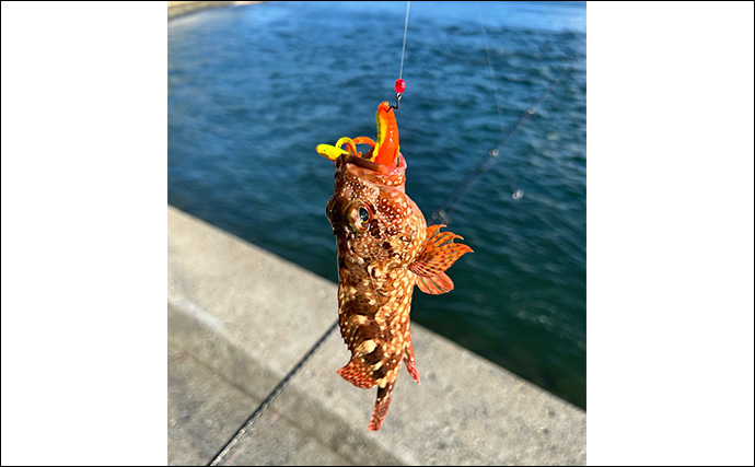 すると、ゴンっと強いアタリが手元に伝わりました。魚信は強いものの、浮いてきたのは小型のカサゴでした。どうもこのサイズが多くいるようで、同じパターンで連続ヒットします。楽しいのですが本命ではないため、探り方を変更することにしました。