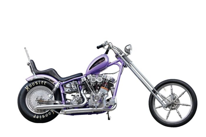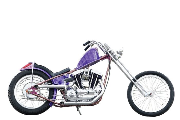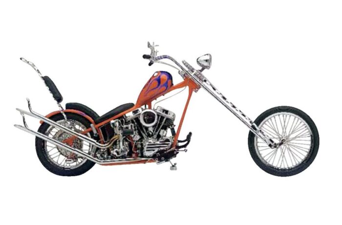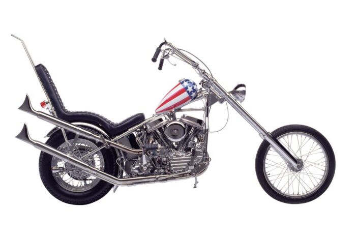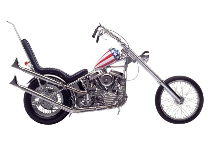 チョッパーと聞いてほとんどの人が思い浮かべる存在が1969年公開の映画『イージー☆ライダー』に登場したこのマシンだろう。14インチオーバーのフロントフォークやマスタングタンク、アップスゥイープマフラーにリジッドフレームの立ち姿はまさに永遠の定番だ。ベースは1965年式パンヘッドである。