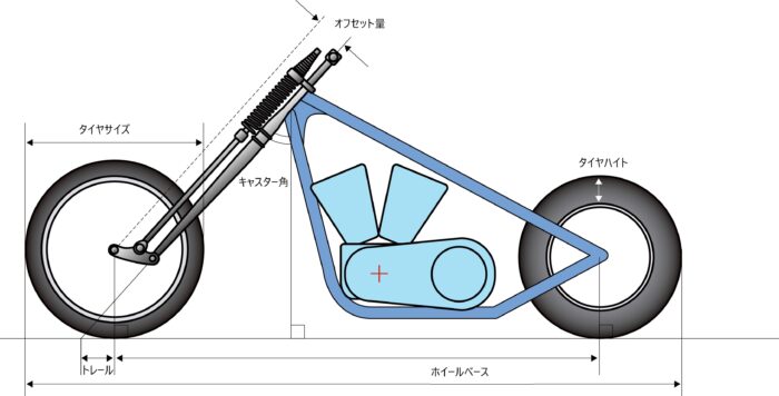 ここまで駆け足でロングフォークについて紹介してきたが、その中で追求すべきは各部の数値、トータルの車体ディメンションだろう。その中でも重要なのはオフセット量やネック部のキャスター角、フォークの長さやタイヤサイズによって変わるトレール量で、その基本的に正しい数値は約10㎝以内。旋回性に関わるホイールベースやフォークやホイールの自重の計算も当然、重要だ。