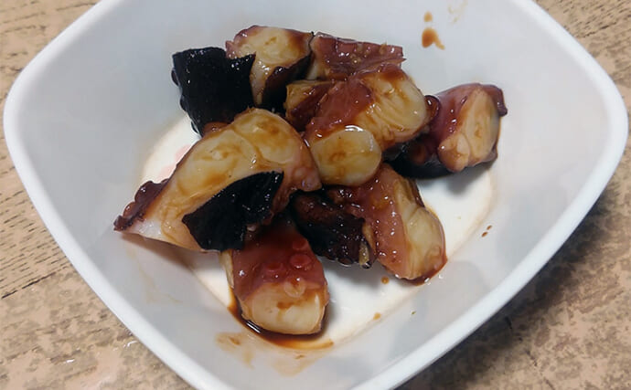 堤防でたまに釣れるマダコ。調理しやすいうえ、料理のレパートリーも豊富だ。今回は、からしじょう油和えにしてみた。
