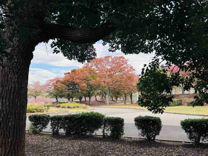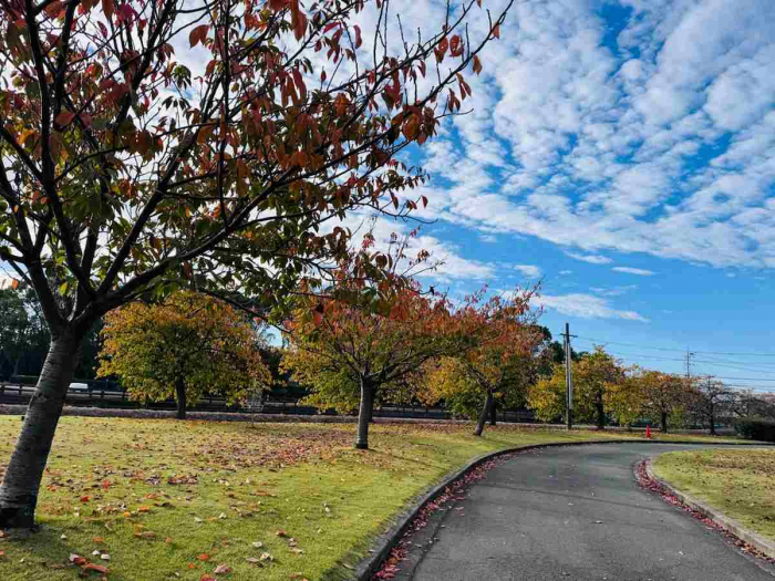 ウォーキングはお天気の良い日が最高ですね。今の時期は木々の紅葉や芝生に落ちている葉の様子に深秋を感じます。