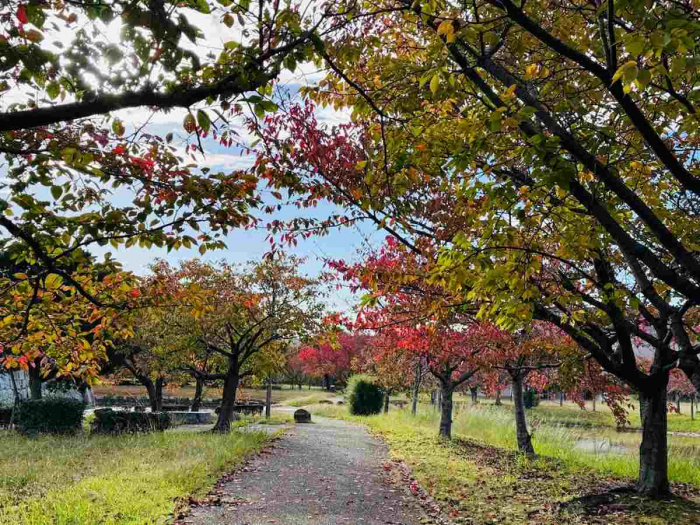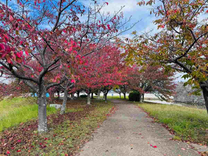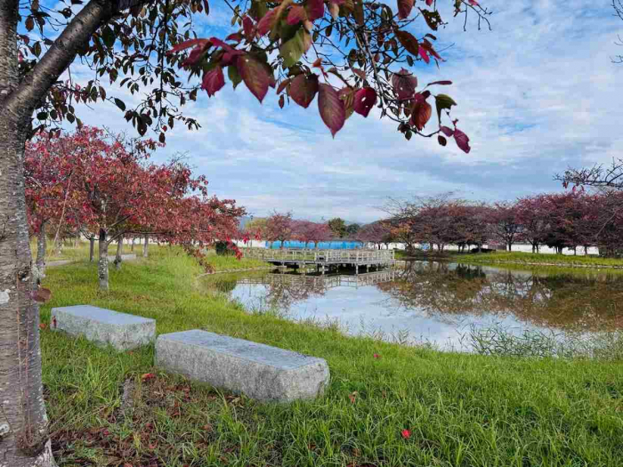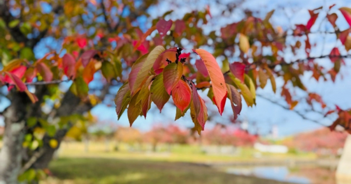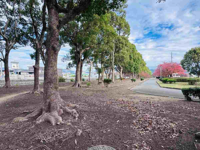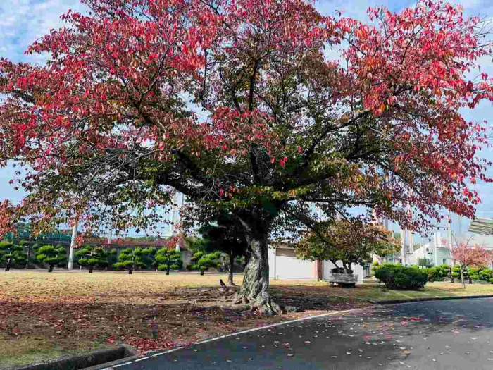 春にはソメイヨシノや河津桜が咲き誇る絶景スポットとして親しまれています。今の季節は、春のうららかなピンク色から紅色に様変わりしている桜の木を見ながら広場を一周するのがオススメ。