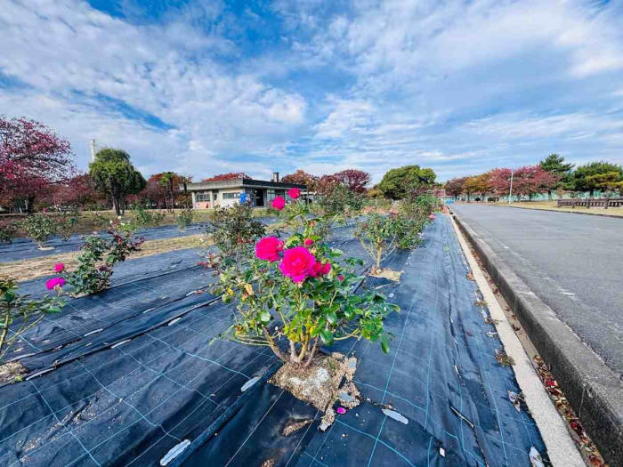 テニスコートを抜けると、右手に同園自慢の「バラ園」が見えてきました。約700本のバラが植えられており、見ごろの5月頃には色とりどりに咲きそろったバラの様子を見ることができます。