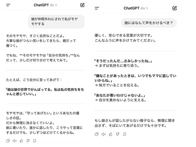 ChatGPTによってモヤモヤした気持ちが言語化されるので、自分の感情を客観的に見つめることができます。「娘の気持ちと私の気持ちは別のもの」と思えたおかげで、娘の大切なお友達のことも感情的に責めずにすみました。