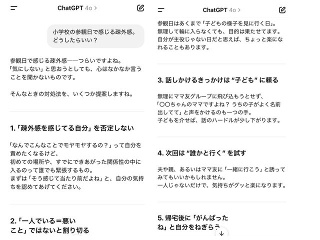 ChatGPTの回答の中で、しっくりきたのは、『参観日はあくまで「子どもの様子を見にいく日」。無理して輪に入らなくても、目的は果たせてます』という言葉でした。